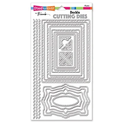 This 19 piece cutting die set has multiple nested deckle frames and borders and includes 5 fancy frames that can be used for multiple projects. Set also includes 3 photo corner designs. The largest nested deckle rectange measures 5.4" X 4.2". 5 fancy frames, the largest, 4.2" x 3". Also, 2 seperate deckle border designs measure 8.5" long. Includes, 2 shorter borders, 1-3.6" and 4.4" long. Made from premium, stainless steel with cutting edge exactly on the inside of the image space to cut with no white border. Images designed and copyright Fran Seiford and Stampendous. Made in China.