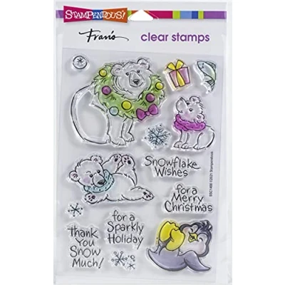 No matter which pole you prefer, these charming animals are ready to play in the snow. Polar bears and penguins frolic at holiday time. 14 stamps. This Large 4 X 6 inch set of Perfectly Clear Stamps features premium photopolymer images from exclusive Fran Seiford artwork. Interactive images work together for dozens of fun looks. Use with acrylic handle sold separately. Made in the USA