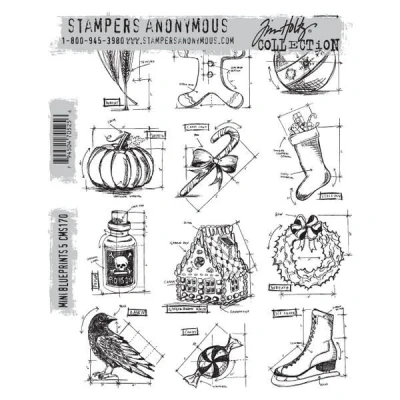 Tim Holtz Cling Mount Stamps: Mini Blueprints 5.# TWe've deeply etched red rubber cling mount rubber stamps that adhere to any clear acrylic block. We highly recommend using them with Tim Holtz Grid-Blocks. Raven measures approximately 1 3/4" x 1 3/4", stocking measures approximately 1 1/2" x 2 1/8". Stamps come on a 3-hole punched sheet for easy storage. MPN TH-CMS170