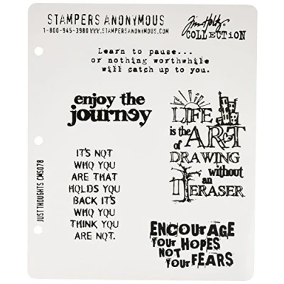 Great for using with Tim's signature distressing techniques! These red rubber stamps come mounted on cling foam so you can use them with any acrylic block (sold separately) Stamps come on a 3-hole punched sheet for easy storage in the Tim Holtz Stamp Storage Binder (also sold separately) This package contains one 8-1/2 by 7-inch sheet of stamps Design: Just Thoughts by Tim Holtz