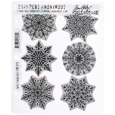 Tim Holtz Cling Mounted Stamps: Swirly Snowflakes Let it snow! Six etched red rubber cling mount rubber stamps that adhere to any clear acrylic block. We highly recommend using them with Tim Holtz Grid-Blocks. Each snowflake measures approximately 2 5/8" x 2 5/8". Stamps come on a 3-hole punched sheet for easy storage. AGCMS319 MPN CMS319