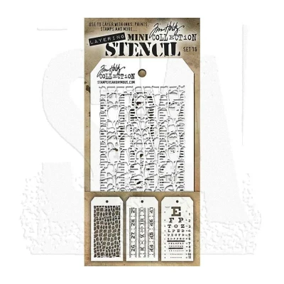 Tim Holtz Mini Layering Stencil Set #16 These mini stencils feature the same designs as Tims standard Layering Stencils, but they are a scaled down version of the originals. They are perfect for layering inks, paints, and stains onto portions of your project, while allowing more of the design to show. Use them as a set or separately for so many creative possibilities. This set includes the following mini stencils: Crocodile, Measured, and Eye Chart. Tag-shaped mini stencils measure approximately 3 1/8" x 6 1/4", with a convenient hole in top to attach with a Cable Binder Ring (sold separately). MST016 AGMST016 AGMST016 MPN MST016