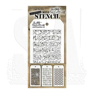 Tim Holtz Mini Layering Stencil Set #17 These mini stencils feature the same designs as Tims standard Layering Stencils, but they are a scaled down version of the originals. They are perfect for layering inks, paints, and stains onto portions of your project, while allowing more of the design to show. Use them as a set or separately for so many creative possibilities. This set includes the following mini stencils: Shatter, Halloween, and Batground. Tag-shaped mini stencils measure approximately 3 1/8" x 6 1/4", with a convenient hole in top to attach with a Cable Binder Ring (sold separately). MST017 AGMST017 AGMST017 MPN MST017
