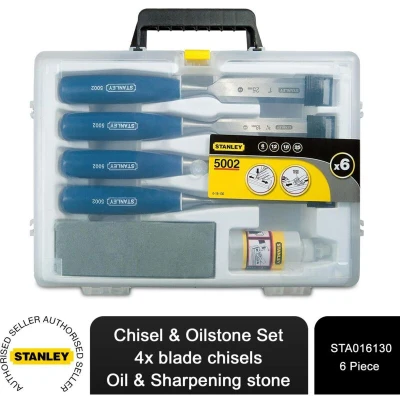 General description Stanley Bevel Edge Chisel Set is designed for tradesmen, featuring a ground finished, hardened and tempered alloy steel blade. The blade is lacquered for rust prevention and fitted with a solid one-piece, impact-resistant blue polypropylene handle. This set is supplied in a carry case along with a sharpening stone and oil. Technical specifications Blade Width: 6mm, 12mm, 18mm, 25mm MPN: 0-16-130 EAN: 3253560161309 Compatibility and accessories 4 x Wood chisels: 6mm (1/4 in), 12mm (1/2 in), 18mm (3/4 in), and 25mm (1 in) 1 x Carry Case 1 x Oil 1 x Sharpening stone Other information
