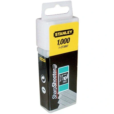 General description These are flat narrow crown staples designed for use with compatible staplers. They are suitable for securing cables and other lightweight materials. The staples are made to ensure a secure hold and easy installation, making them ideal for DIY and home improvement projects. Technical specifications Size: 10 mm in length Quantity: 1000 staples per box Type: Flat narrow crown staples Compatibility and accessories Compatible with cable staplers such as the 6-CT-10 model Designed for use with staple guns that accept 10 mm staples Compatible with FatMax® Composite 4-in-1 Stapler and FatMax® Lightweight Composite Hammer Tacker Installation Insert the staples into the stapler Position the stapler over the material to be secured Press the trigger to insert the staples securely into the surface Usage Ideal for fastening cables, wires, and light materials Suitable for DIY projects, home repairs, and electrical installations