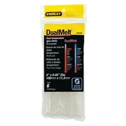 General description The Stanley dual melt, all-purpose glue sticks are suitable for a wide variety of gluing applications to meet most craft, hobby, and household requirements. This set of 24 glue sticks is designed for use with glue guns in various DIY, repair, and home improvement projects. They provide a reliable and durable adhesive solution for a wide range of applications. Technical specifications Width: 11 mm Length: 100 mm Quantity: 24 pieces per pack Compatibility and accessories Compatible with standard glue guns, including those used for DIY, repairs, and crafts Installation Insert the glue stick into the glue gun's chamber Heat the glue gun until the glue stick melts and is ready for use Usage Apply heat to melt the glue and press the surfaces together Use in low or high-temperature glue guns depending on the project requirements Use the low setting for bonding paper and heat-sensitive products, and the high setting for china, leather, etc. (non-porous products)