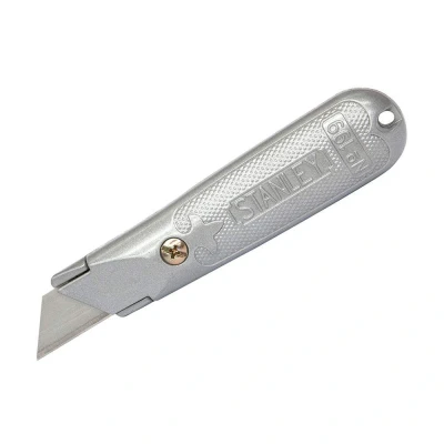 General description This Stanley fixed blade utility knife, launched in 1936, features a classic handle design with a unique “Fleur-de-lis pattern”. It is designed for durability and precision, with a robust fixed blade and a strong yet lightweight die-cast zinc body. The ergonomic design ensures comfort during use while maintaining safety, even under forceful applications. Technical specifications Color: Silver Product length: 140 mm Material: Zinc die-cast Compatibility and accessories Accepts most types of replacement Stanley utility blades Includes three replacement blades (Stanley 1992) Installation Blade replacement involves opening the handle to access stored blades and securely attaching a new blade using the InterLockTM system. Usage Ideal for cutting tasks requiring a fixed blade with a secure grip and reliable performance. Suitable for professional and DIY applications where precision and safety are important. Other information The interlocking nose design holds blades