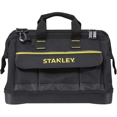General description The Stanley 1-96-183 Open Mouth Tool Bag is designed for strength and durability, made from heavy-duty 600 denier fabric and featuring a reinforced plastic base. It offers easy carrying of heavy loads with its shoulder strap and provides excellent organization with multiple internal and external pockets. Technical specifications Dimensions: 450 x 235 x 275 mm Size: 41 cm (16 inch)