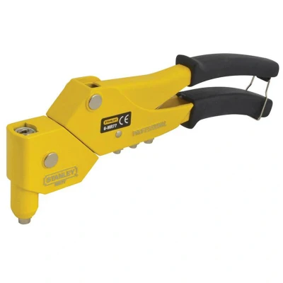 General description The Stanley MR77 all-steel riveter is a versatile hand tool designed for fastening tasks in DIY projects and professional work. It features a 360° swiveling head for ease of use at any angle, making it suitable for installing steel and aluminum rivets. Its ergonomic design and integrated components ensure durability and efficiency for various riveting applications. Technical specifications Type: manual rivet gun Head rotation: 360° Compatible rivets: steel and aluminum – diameters 2 mm, 3 mm, 4 mm, 5 mm Material of body: die-cast metal Handle material: ergonomic overmolded grip Dimensions: length 287 mm, width 100 mm, height 35 mm Net weight: 0.85 kg Includes: 1 rivet gun, 4 interchangeable heads, 1 key Compatibility and accessories Compatible with steel and aluminum rivets in sizes 2 mm, 3 mm, 4 mm, and 5 mm Includes interchangeable heads and a key for easy customization and maintenance Installation Insert the appropriate rivet into the nose of the tool Select the