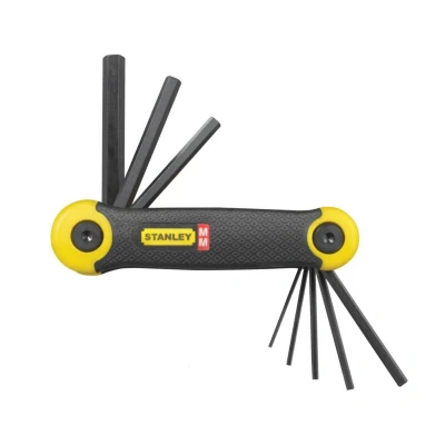 General description This Stanley 8 Piece Metric Folding Hex Key Allen Key Set (Model STA269264) is designed for easy and efficient use. It features ergonomic handles that provide a secure grip, even with wet or oily hands. Each wrench is clearly marked with its size for quick identification and access. The set includes a holder for organized storage. Technical specifications Set includes 8 Allen wrenches: 1.5mm, 2mm, 2.5mm, 3mm, 4mm, 5mm, 6mm, 8mm Material: Steel with black phosphating coating Handle design: Ergonomic for comfortable grip Features beveled edges for easy insertion Compatibility and accessories Compatible with standard Allen screws and fasteners Supplied with a holder for organized storage Installation No installation required; simply select the appropriate size wrench from the holder. Usage Use the wrench to tighten or loosen Allen screws and bolts. Ensure a firm grip for safety and efficiency. Other information Phosphate finish for corrosion protection Chamfered tip