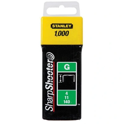 General description Stanley Sharpshooter Type G heavy-duty staples are designed for durability and long-lasting performance. Made from rust-resistant, coated steel, these staples are suitable for a wide range of tasks and are compatible with most electric and manual staplers of the G type. Each pack contains 1,000 staples, neatly stored in a sturdy, resealable package for convenient use and storage. Technical specifications Leg length: 8 mm Material: Coated, rust-resistant steel Quantity: 1,000 staples per pack Compatibility and accessories Compatible with Stanley models: 69-809, TR60, TR100 series, TR200 series, TRE500 series, PHT150, G11, TR75, TR150HL, TR250, and TR350 heavy-duty hand tackers Compatible with HT150, HT350, and FatMax hammer tackers and 4-in-1 staplers Installation Insert the staples into your compatible stapler Ensure the stapler is properly loaded before use Usage Use for fastening paper, fabric, or light materials Suitable for DIY projects, home repairs, and