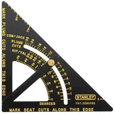 General description This Stanley Adjustable Quick Square features a black body with yellow graduations for maximum readability in all light conditions. It is designed for multipurpose use, functioning as a rafter square, saw guide, bevel, and protractor. The square includes Common Jack and Hip and Valley scales, making it a versatile tool for various roofing and carpentry tasks. Technical specifications Size: 170mm (6.3/4in) Construction: Heavy-duty and durable Markings: Permanent