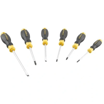 General description STANLEY® 6 Piece CUSHION GRIP™ Screwdriver Set is designed for durability and comfort. Each screwdriver is made from high-strength chrome vanadium steel, reducing the chance of tip breakage. The magnetic black oxide tip enhances screw retention and extends product life, while the chrome plated bar protects against rust. Technical specifications Material: Chrome vanadium steel Tip type: Magnetic black oxide Handle type: Bi-material, ergonomic Handle shape: 8-sided octagonal Included screwdrivers: 2 x Pozidriv (PZ1 x 75mm, PZ2 x 100mm), 2 x Parallel (3.5 x 60mm, 4.0 x 100mm), 2 x Flared (5.5 x 100mm, 6.5 x 150mm) Usage The clear tip ID on the handle allows for easy identification of the right screwdriver for each job. The ergonomic design ensures comfort during use, while the tethering hole provides safety when working at heights.