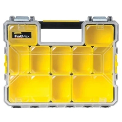 General description The Stanley FatMax® Deep Professional Organiser is designed for efficient storage of small parts, components, or accessories. It features 10 removable storage compartments that can be stacked together for convenience outside the organiser. The organiser is made from durable polypropylene and includes a virtually unbreakable lid for easy visibility of contents. Technical specifications Dimensions: 446 x 357 x 116 mm Weight: 2 kg Material: Polypropylene with a polycarbonate lid Usage Ideal for storing small parts and accessories Compartments can be removed and stacked for versatile use Waterproof seal prevents water, rust, and foreign particles from entering Other information Lockable lid prevents compartments from mixing during transit Moulded grip handle for comfortable carrying Multiple organisers can be clipped together using side latches for easy transportation