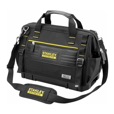 General description The STANLEY® FatMax® PRO-STACK™ Soft Tool Bag is designed for maximum organization with multiple pockets and tool loops, ideal for storing screwdrivers, pliers, and other hand tools. It features a front zip compartment for personal belongings and a card holder for easy identification. Constructed from durable 600 denier fabric, this bag is resistant to wear and tear, and it includes a rigid waterproof base to protect contents from dirt and moisture. A padded shoulder strap and carry handle ensure comfort during transportation. Technical specifications Outer Dimensions: 45 x 30 x 25 cm Max. Capacity: 30 kg Other information This bag is part of the STANLEY® FATMAX® PRO-STACK™ range, which offers a customizable, interlocking, stackable, and portable storage system tailored to your trade with various module and transport options.