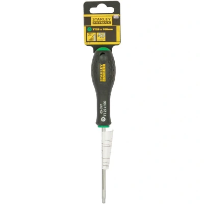 General description The Stanley FatMax Tamper-proof TORX tip screwdriver is designed for professional-grade performance, featuring a nearly unbreakable connection and a chrome-vanadium steel blade that ensures high durability. The Tamper Torx tip provides a secure grip in screw heads, minimizing the risk of slipping or damage. Its ergonomic handle is designed with a soft, non-slip grip for maximum torque and comfort during use, while the smooth domed end allows for quick and comfortable turning. Technical specifications Blade material: Chrome-vanadium steel Tip type: Tamper Torx Blade length: 100 mm (4 in) Overall length: 100 mm Handle: Ergonomic, soft grip, non-slip Compatibility and accessories Designed for use with Tamper Torx screws Compatible with various screw sizes marked on the handle Installation Insert the Tamper Torx bit into the screw head Apply firm, steady pressure and turn clockwise or counterclockwise as needed Usage Ideal for professional and heavy-duty applications