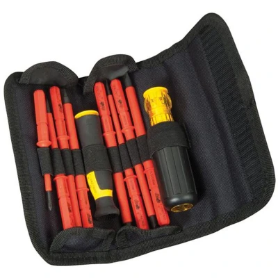 General description This is a set of insulated screwdrivers designed for electrical work up to 1000V. The set includes multiple interchangeable blades and two handles suitable for various applications. The screwdrivers feature black sandblasted tips for improved grip and corrosion resistance, ensuring durability and safety during use. The set is ideal for professional electricians and DIY enthusiasts working on electrical installations. Technical specifications Insulation voltage: 1000V Blade types: Slotted, Phillips, and Pozidriv Blade sizes: Slotted 3mm, 5.5mm, 6.5mm; Phillips PH0, PH1, PH2; Pozidriv PZ1, PZ2 Blade material: Hardened steel with black sandblasted finish Handles: Two types – a standard handle and a precision handle with swivelling head Compatibility and accessories Compatible with various electrical screw sizes and types Includes multiple interchangeable blades and two handles for versatile use Supplied with a protective carrying pouch Installation Insert the desired