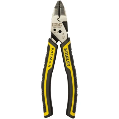 General description Stanley FatMax 5-in-1 Diagonal Pliers are designed for durability and versatility, made from induction-hardened, drop-forged steel. These pliers feature a semi-flush cut tip for precise flush cuts of soft materials and are equipped with bi-material handles for a comfortable and secure grip. They are ideal for various tasks including cutting, stripping, crimping, and bolt cutting. Technical specifications Handle Type: Bi-material Length: 180mm (7 inches) Material: Induction-hardened, drop-forged steel Features: Flush cut tip, wire stripper, wire cutter, wire crimper, bolt cutter Compatibility and accessories Suitable for cutting and stripping soft wires and bolts up to M4 No additional accessories required Installation No installation required; ready to use out of the box Usage Use for cutting, stripping, crimping, and bolt cutting tasks Ideal for electrical work, DIY projects, and home improvement tasks Other information