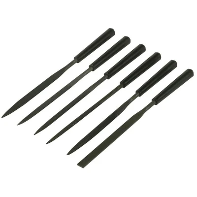 6 piece needle file set with high carbon blades for strength and durability. All are 160mm in length. Contains: 1 x flat, 1 x flat tapered, 1 x half round, 1 x round, 1 square and 1 three sided (triangle).