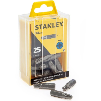 General description These Stanley Pozidriv Insert Bits are precision machined for the perfect fit, forged for added tip strength, and ground for long life and durability. They are suitable for industrial, construction, and DIY applications, compatible with most power tools, bit holders, and hex screwdrivers currently in use. Technical specifications Material: Chrome-vanadium steel Hardness: Hardened and tempered for durability Tip type: Pozidriv Tip size: No.3 (PZ3) Bit length: 25mm Standards: ISO compliant Compatibility and accessories Compatible with most electric screwdrivers, bit holders, and hex screwdrivers Suitable for use with various power tools and manual screwdrivers Installation Insert the bit into the compatible screwdriver or bit holder Ensure it is securely fitted before use Usage Use for driving screws with Pozidriv heads Apply appropriate torque to avoid damaging the bit or screw Other information Available in packs of 3, 25, and 100 pieces for different project needs