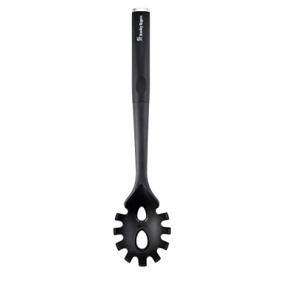 HEAT-RESISTANT CONSTRUCTION: safe for non-stick cookware, this pasta server withstands heat while protecting your pots and pans, maximum temperature rating 200 degrees Celsius UPLIFT HANDLE DESIGN: modern handle keeps the head raised off benchtops, reducing mess while cooking or serving pasta PRONGED BOWL WITH DRAINAGE HOLE: grips spaghetti and other long pasta securely while draining away excess water for clean serving BUILT-IN SERVING SUGGESTIONS: includes practical design detail to help portion pasta accurately at the table BELLY GRIP HANDLE: ergonomic handle provides comfort, control and stability for serving pasta dishes effortlessly INCLUDES: 1 x Stanley Rogers Contempo Spaghetti Spoon with Uplift Belly Grip Handle, Heat-Resistant Non-Stick Safe Cooking Utensil with Pronged Bowl, Drainage Hole, Pasta Server for Home & Kitchen, 34x7.5x5cm, Black