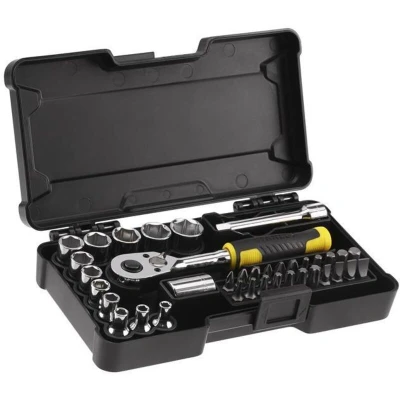 General description This 37 Piece STANLEY® 1/4in Compact Socket Set is designed for efficiency and productivity. The next generation sockets feature a maxidrive profile, maximizing the contact between the socket and nut/bolt, with visible dimensions for easy identification. Technical specifications Number of pieces: 37 Socket sizes: 4, 4.5, 5, 6, 7, 8, 9, 10, 11, 12, 13, 14mm Bits included: 3 x 1/4in Phillips (PH1, PH2, PH3), 3 x 1/4in Pozi (PZ1, PZ2, PZ3), 5 x 1/4in Hex (3, 4, 5, 6, 7), 7 x 1/4in TORX (T10, T15, T20, T25, T27, T30, T40), 4 x 1/4in Slotted (4, 5, 6, 7) Includes: 1 x 1/4in Bit Holder, 1 x 1/4in 72T Bi Material Ratchet, 1 x Compact Case