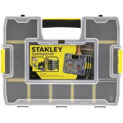 General description The Stanley Sortmaster Junior Organiser is a versatile toolbox designed for storing and transporting tools with modular compartments. It offers 512 different configurations, allowing for customization to accommodate various tool sizes. The organiser features adjustable dividers and a seal-tight compartment to keep heavy components secure during transport. Its see-through lid enables easy identification of contents, making it ideal for organizing small items and fixings. Technical specifications Dimensions: 375 x 292 x 67 mm Material: Polypropylene Number of Compartments: 14 Overall Height: 67 mm Overall Length: 292 mm Overall Width: 370 mm Manufacturer Part Number: 1-97-483 Code: 0944636 Compatibility and accessories Suitable for storing a wide range of hand tools and small equipment Modular compartments allow customization for different tools Installation No installation required; ready to use out of the box Usage Organize and store tools securely Transport