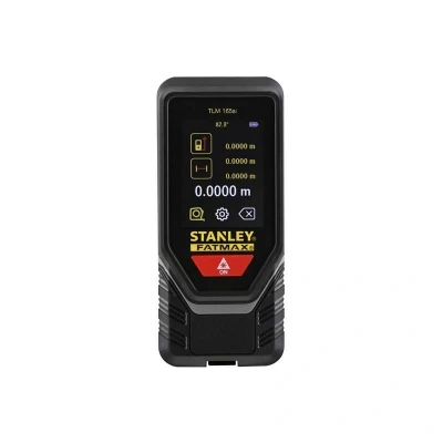 General description The STANLEY® TLM165SI FatMax® Laser Measurer is a versatile tool that provides precise distance, area, and volume calculations. It also allows for indirect height measurements using Pythagorean calculations. Measurements can be taken from various points including the front, back, tripod mount, or end toe of the device, and it features a toe piece for measuring from room corners. The device is designed for durability with an IP54 rating, protecting against dust and water spray. Technical specifications Accuracy: ±1.5mm Operating Range: 0.1 to 60m Power Supply: 3 x AAA batteries (supplied) Automatic Off: 90/180 seconds Weight: 100g Compatibility and accessories Compatible with the STANLEY® Smart Connect™ App (download separately) via Bluetooth® connectivity Fitted with a 1/4 inch thread for tripod mounting Installation Requires 3 x AAA batteries for operation Usage Easy to operate with a large color touchscreen Includes an addition/subtraction calculator, automatic