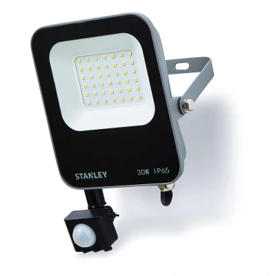 The Stanley 30W LED Floodlight with PIR Sensor is a powerful and smart lighting solution, perfect for illuminating and securing outdoor areas like gardens, driveways, and building exteriors. Built with a durable die-cast aluminium body and a polycarbonate diffuser, this floodlight is designed for long-lasting performance in tough outdoor conditions, with an IP65 rating to protect against dust and water.This floodlight features a PIR sensor with adjustable LUX sensitivity and a timer, detecting movement up to 12 metres away. It ensures the light automatically turns on when needed, providing added security and energy savings. The 3300 lumens of bright, daylight-quality 6500K light and a 180 beam angle offer wide, even coverage, perfect for large areas.For added versatility, the floodlight is equipped with an adjustable bracket, allowing for horizontal and vertical movement, so you can direct light exactly where you need it. Pre-wired with a 500mm cable for quick and easy installation, this floodlight is built to last, offering a long 25,000-hour lifespan, ensuring dependable performance for years to come.With compact dimensions of H:193mm W:183mm Proj:54mm, the Stanley 30W LED Floodlight with PIR Sensor combines smart functionality, durability, and powerful lighting in a space-saving design.