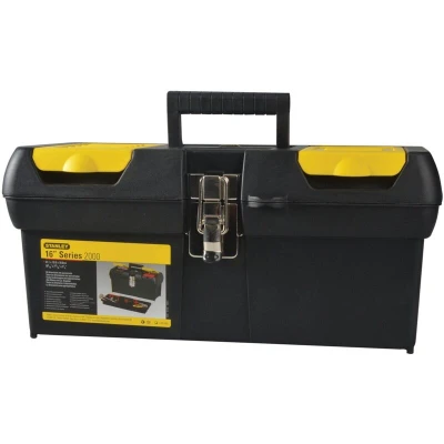 General description This Stanley 16 inch toolbox is designed for durability and convenience, featuring metal latches and hinges that enhance its weight capacity. It is ideal for storing everyday essential tools and includes top lid organizers for small parts such as screws and fixings, along with a removable tote tray for smaller tools and components. Technical specifications Outer Dimensions: 40 x 18.5 x 19 cm Other information Complete with a padlock eye for security Soft grip handle for comfort during transportation