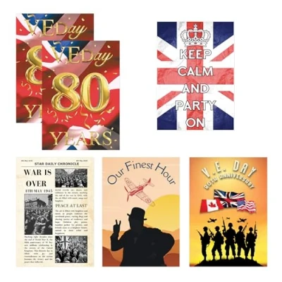 Star Cutouts RD080 VE Day 80 Year Celebration Posters Mixed 6 Pack Cardboard Cut Out Height 44cm Ideal for British Theme, Parties, National Celebrations & Decorations