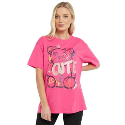 STAR FASHION Ladies Cute Teddy Print Oversized T Shirt Top Womens Playful Trendy Bear Short Sleeve Tshirt Hot Pink 12 14