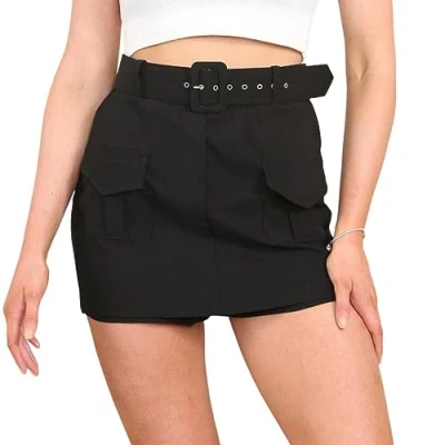 STAR FASHION Ladies High Waisted Cargo Skort with Pockets Belted Skirt Hiking Running Skorts for Summer UK Size 14 Black