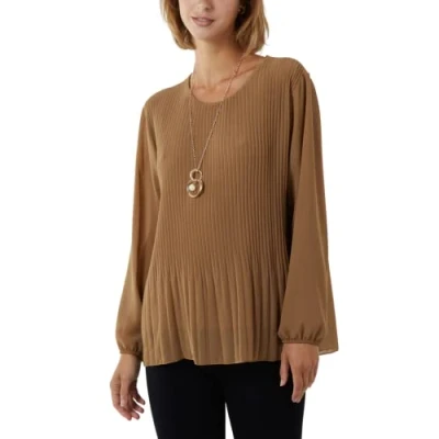 STAR FASHION Ladies Italian Pleated Necklace Top Lined Chiffon Front Round Neck Long Sleeve Blouse with Pendant One Size UK 8 to 16 Camel