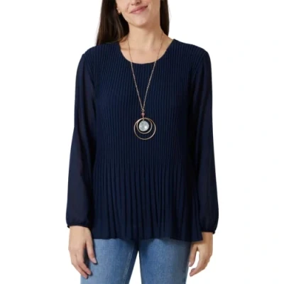 STAR FASHION Ladies Italian Pleated Necklace Top Lined Chiffon Front Round Neck Long Sleeve Blouse with Pendant One Size UK 8 to 16 Navy