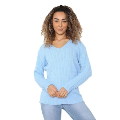 STAR FASHION Ladies Long Sleeve All Over Cable Soft Knitted Jumper Womens V Neck Winter Wear Sweater Casual Top UK Size Sky Blue 8 to 10