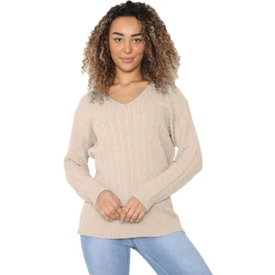STAR FASHION Ladies Long Sleeve All Over Cable Soft Knitted Jumper Womens V Neck Winter Wear Sweater Casual Top UK Size Stone 16 to 18