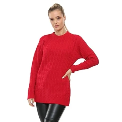 STAR FASHION Ladies Round Neck Knitted Long Sleeve Super Soft Knit All Over Cable Jumper Womens Casual Pullover Cosy Baggy Winter Top Sweater Red 8 10