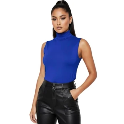 STAR FASHION Ladies/Women Sleeveless Stretchy High Turtle Polo Neck Vest Top Fashionable and Causal T Shirts Blue 20 22