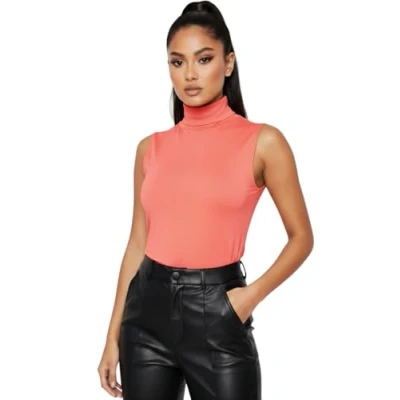 STAR FASHION Ladies/Women Sleeveless Stretchy High Turtle Polo Neck Vest Top Fashionable and Causal T Shirts Coral 20 22