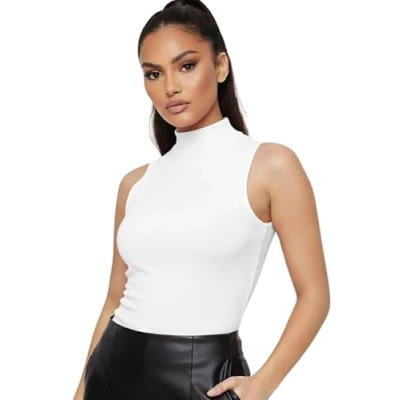 STAR FASHION Ladies/Women Sleeveless Stretchy High Turtle Polo Neck Vest Top Fashionable and Causal T Shirts White 20 22