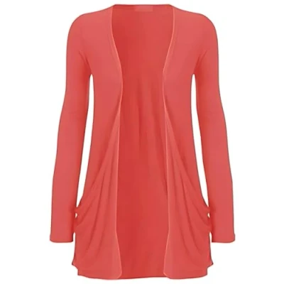 STAR FASHION New Ladies Open Front Boyfriend Cardigan Women Plain Long Sleeves Pocket Stretch Top Coral 12 14