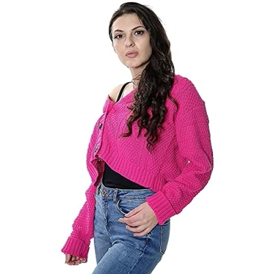 STAR FASHION New Women's Ladies Chunky Cable Knitted Cropped Cardigan Long Sleeve 3 Button Short Crop Top Warm Sweater Jacket Pary Wear UK Size 8 14 Cerise