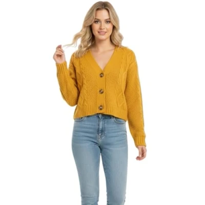 STAR FASHION New Women's Ladies Chunky Cable Knitted Cropped Cardigan Long Sleeve 3 Button Short Crop Top Warm Sweater Jacket Pary Wear UK Size 8 14 Mustard