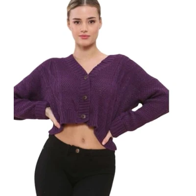 STAR FASHION New Women's Ladies Chunky Cable Knitted Cropped Cardigan Long Sleeve 3 Button Short Crop Top Warm Sweater Jacket Pary Wear UK Size 8 14 Purple