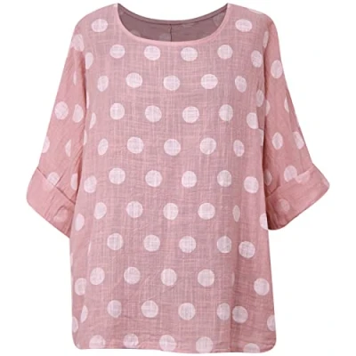 STAR Fashion New Womens Spotty Polka Dotted Italian Top Ladies Trendy Printed Three Quarter Rolled Up Sleeves Casual Wear Summer Shirt One Size UK 10 to 18 Dusty Pink
