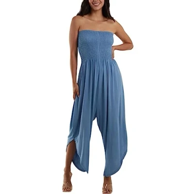 STAR FASHION Sheering Harem Pants Jumpsuit for Women 2 in 1 Hareem Jumpsuits Trousers Ladies Strapless Romper Shirred Top Overalls Genie Denim
