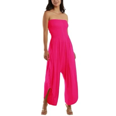 STAR FASHION Sheering Harem Pants Jumpsuit for Women 2 in 1 Hareem Jumpsuits Trousers Ladies Strapless Romper Shirred Top Overalls Genie Hot Pink