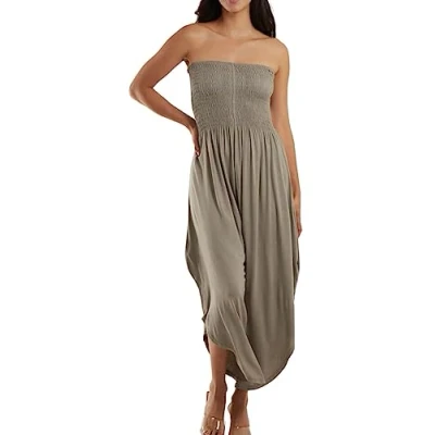 STAR FASHION Sheering Harem Pants Jumpsuit for Women 2 in 1 Hareem Jumpsuits Trousers Ladies Strapless Romper Shirred Top Overalls Genie Mocha