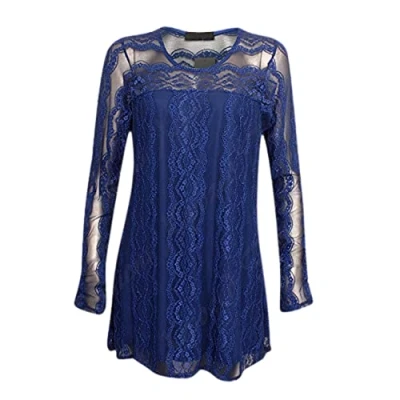 STAR FASHION Stylish Lace Lined Long Sleeve Summer Tunic Top Loose Fit Pleated Party Tees Hem Shirt for Woman (Royal Blue)